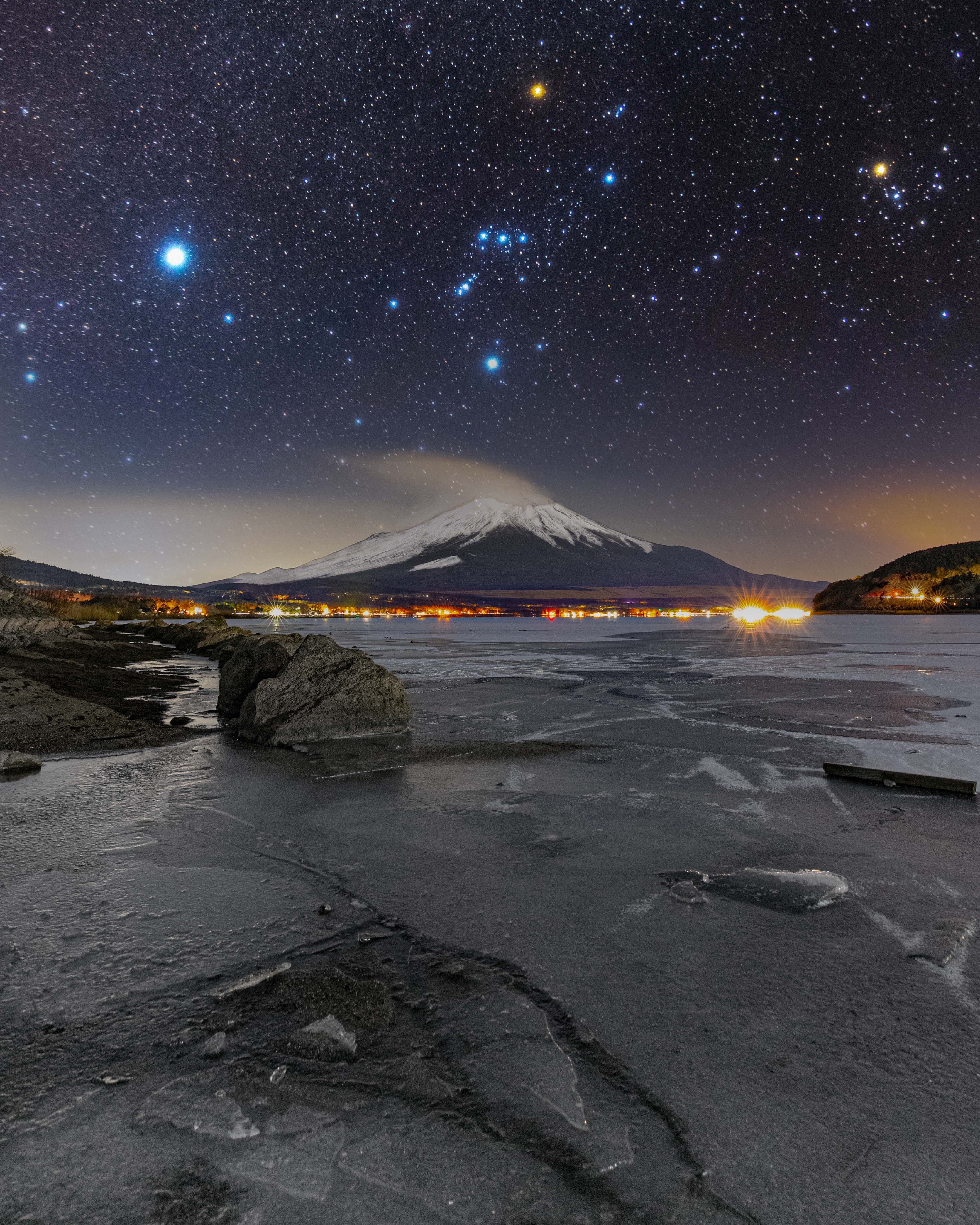 凍てつく山中湖・雪の富士山とオリオン座(スマホ用)